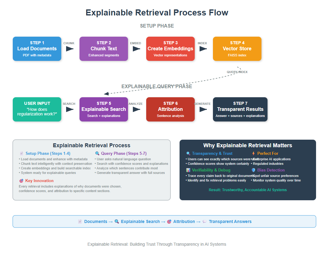 Explainable Retrieval is a technique that makes RAG (Retrieval-Augmented Generation) systems transparent by showing users which documents were retrieved, why they were chosen, and how confident the system is in its selections. This enables better trust, debugging, and bias detection in AI applications._