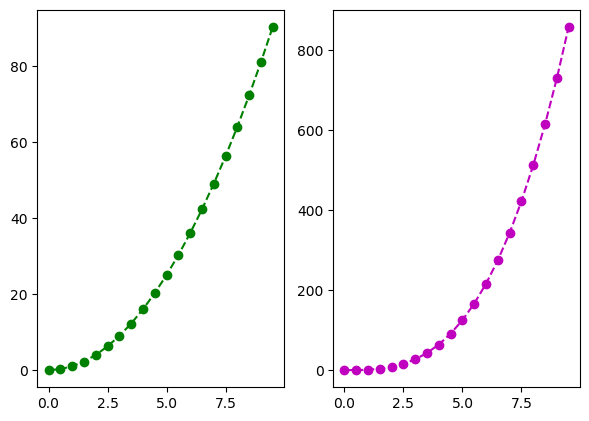 axes[1].plot(x, y2, 'm--o')